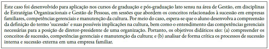 O professor precisa estimular os alunos a identificarem, na narrativa do caso, como os objetivos e a disciplina foram escolhidos e, depois, refletirem sobre outros meios para sua delimitação. No caso, a motivação da escrita foi sua aplicação em uma aula de sucessão em empresas familiares, da disciplina de Estratégias Organizacionais. Logo, a escolha da disciplina foi natural e os objetivos respeitaram o intuito da aula destinada. Entretanto, conforme mencionado anteriormente, o planejamento da escrita pode seguir diferentes padrões. Às vezes os autores iniciam a escrita ao conhecerem uma situação-problema interessante no cotidiano organizacional, consequentemente, precisam refletir sobre um tópico dentro de uma disciplina que se relacione ao problema identificado e definir objetivos que lhe estejam alinhados. Os objetivos devem ser definidos pensando no aluno que vai ler e interpretar o caso e não no professor que irá aplicá-lo (Silva & Bandeira-de-Mello, 2021). Os casos são desenvolvidos para servir a um ou mais objetivos de aprendizagem, e os autores precisam repassar claramente essas informações durante a escrita, dado que a falta de um posicionamento claro prejudica a adoção do caso.