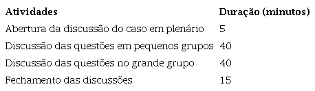 Para discussão, sugere-se que o caso seja disponibilizado aos alunos para leitura prévia, sem as notas de ensino. O professor pode fazer a abertura da discussão em plenário, expondo a dinâmica que será usada para a análise do caso. Propõe-se que seja realizada uma discussão inicial, em pequenos grupos, das questões propostas, e uma discussão final no grande grupo. A modalidade on-line pode ser explorada alternando os membros dos grupos e lhes atribuindo missões dentro do novo grupo alocado, a fim de aumentar o dinamismo nas discussões. Por fim, o professor pode fechar as discussões no grande grupo equalizando as informações, mapeando os discursos dos alunos e relacionando-os aos conceitos teóricos subjacentes. Na Tabela 1, apresenta-se a distribuição de horários proposta para aplicação do caso para ensino em sala de aula.