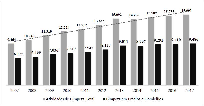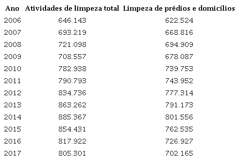 Os dados do Cadastro Central de Empresas (IBGE, 2017a) também nos informam acerca das pessoas empregadas pelo setor de serviços de limpeza no Brasil. Temos que em 2017 a quantidade de pessoas assalariadas pelo setor era de cerca de 805.301, sendo que 87% eram empregadas pelo setor específico de ‘limpeza em prédios e domicílios’. Houve um crescimento entre 2007 e 2017 de 16% no setor de limpeza em geral e um crescimento de 5% em relação ao setor específico de limpeza em prédios e domicílios. É interessante observar que o pessoal ocupado assalariado total enfrentou uma queda de 9% entre os anos de 2014 e 2017, apesar de o número de empresas ter crescido 7%, fator que pode estar relacionado a diversos aspectos como o aumento da produtividade do trabalho ou até mesmo o crescimento da informalidade no trabalho doméstico, uma vez que os dados expressam o pessoal ocupado assalariado registrado pelas empresas.
