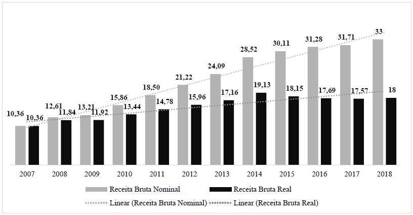 Em relação ao resultado financeiro, foi possível analisar dados relativos à receita bruta relacionada aos ‘serviços de limpeza de prédios e domicílios’, os quais se encontram disponíveis na Pesquisa Anual de Serviços realizada pelo IBGE (2017b). O faturamento (receita bruta) do setor apresentou um crescimento nominal de 206% entre os anos da pesquisa (2007 a 2017), sendo o faturamento nominal de 2017 cerca de R$ 31,7 bilhões. Analisando os dados deflacionados, vemos que mesmo o faturamento real - descontada a inflação - apresentou um crescimento significativo (70%) entre os anos de pesquisa, sendo que o setor de serviços em geral apresentou um crescimento de 77% no mesmo período.