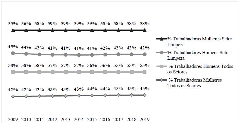 O setor de limpeza no Brasil vem crescendo nos últimos anos e, em 2017, já empregava cerca de 805 mil trabalhadoras. Segundo dados do IBGE (2017a) - Figura 3 - entre 2009 e 2017 temos que o setor de limpeza emprega um percentual maior de mulheres, sendo que, em 2017, 58% dos trabalhadores eram mulheres e 42% eram homens. Ao analisar essa proporção nos demais setores, a relação se inverte, e, em todos os anos, o percentual de homens trabalhadores foi maior que o de mulheres, sendo que, em 2017, considerados todos os setores, 45% dos trabalhadores eram mulheres e 55% homens.