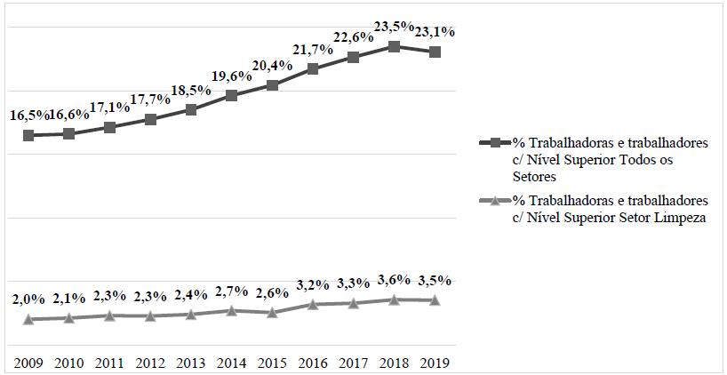 O percentual de trabalhadoras que possuem nível superior no setor de limpeza é historicamente muito baixo, sendo que, em 2019, apenas 4% das trabalhadoras o possuíam contra um percentual de 23% se considerados todos os setores (Figura 4). Além disso, enquanto em todos os setores esse percentual teve um aumento de 7% entre 2009 e 2019, o setor de limpeza se manteve praticamente constante (aumento de 2%).