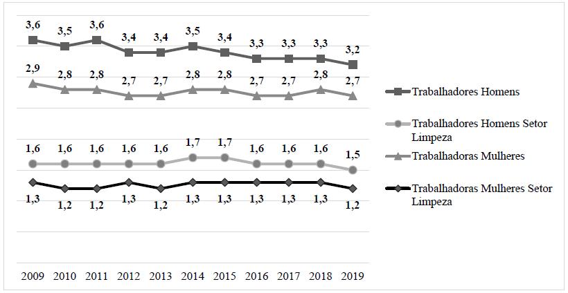 Conforme Figura 5, no que se refere à remuneração, segundo o IBGE (2017a), o salário médio mensal tanto de homens como de mulheres no setor de limpeza é inferior se comparado a todos os setores. Considerando os trabalhadores do sexo masculino, os trabalhadores do setor de limpeza receberam entre 2009 e 2017 em média 53% a menos que os trabalhadores dos setores em geral. As trabalhadoras do sexo feminino as quais trabalham no setor de limpeza receberam em média 54% a menos que as trabalhadoras dos demais setores. Esses dados confirmam a baixa remuneração da força de trabalho envolvida neste setor de ambos os sexos.