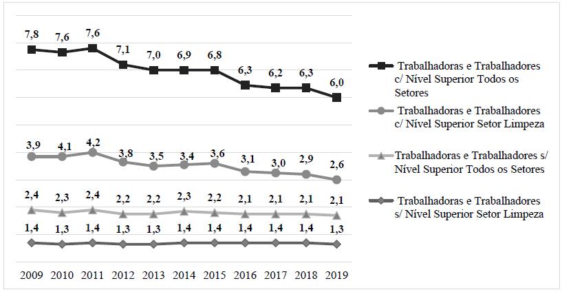 Levando em conta as trabalhadoras e trabalhadores que possuem nível superior, o salário médio mensal no setor de limpeza é historicamente 49% menor que nos setores em geral, já as trabalhadoras e trabalhadores sem nível superior no setor de limpeza recebem historicamente 39% a menos do que nos setores em geral. O comportamento histórico da média de remuneração no período analisado sofreu uma queda no geral, excetuando as trabalhadoras sem nível superior no setor de limpeza, cujo índice se manteve constante ao longo do tempo.
