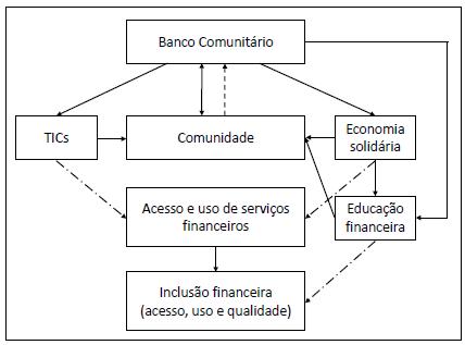 De forma sucinta, o banco comunitário surge da necessidade e da ação da própria comunidade em promover acesso e uso de serviços financeiros (linhas de traço e ponto), tradicionalmente através da economia solidária e mais recentemente fazendo uso de TICs. A economia solidária, por sua vez, impacta a educação financeira, visto que o entendimento da última também considera o comportamento financeiro dos cidadãos em termos coletivos. De forma complementar, o banco comunitário realiza iniciativas específicas de educação financeira na comunidade para, junto ao acesso e uso dos serviços financeiros, promover a inclusão financeira da população local (linha de traço e ponto). Nesse processo, a comunidade responde diretamente à organização sobre o que funciona e o que não funciona localmente (linha tracejada). As linhas contínuas indicam uma relação direta de ação ou consequência entre os conceitos considerados, ou seja, o banco comunitário, originado na comunidade ou por ela, utiliza-se de TICs, da economia solidária e de educação financeira para promover acesso e uso com qualidade de serviços financeiros.