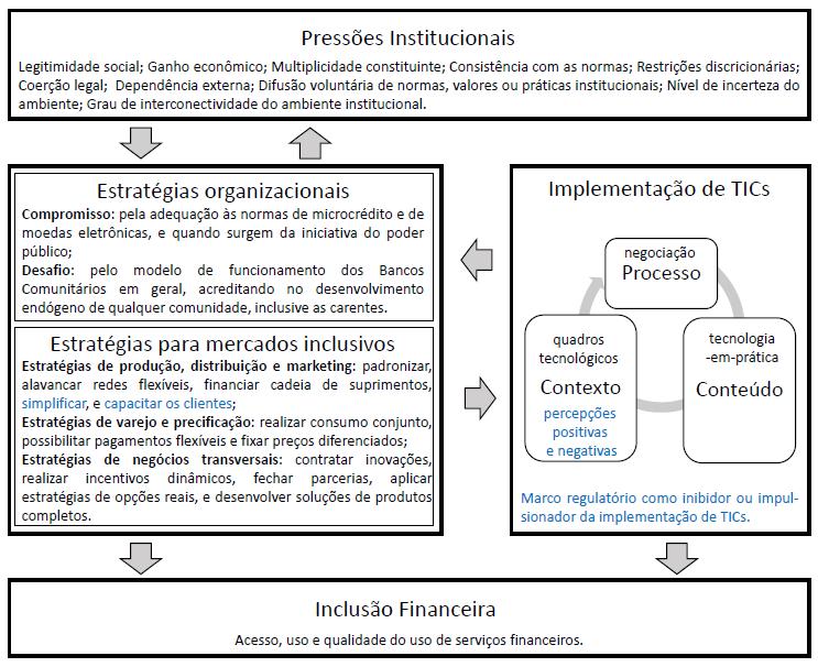 Diante da existência e da atuação dos bancos comunitários baseadas na economia solidária, na educação financeira, e mais recentemente no uso de TICs nos serviços prestados dentro das comunidades, a esquematização da pesquisa (Figura 1) foi desenvolvida para nortear como ocorrem essas relações. Com isso, a análise foi então desenvolvida a partir de três trabalhos norteadores, quais sejam: o institucionalismo (Oliver, 1991), as estratégias voltadas para os mercados inclusivos (Mendoza & Thelen, 2008) e o processo de implementação de TICs (Pozzebon & Diniz, 2012).