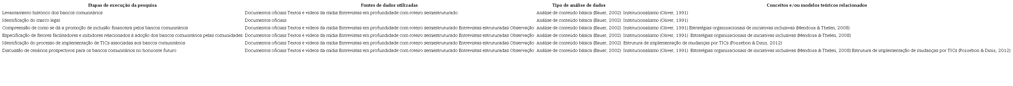 Este trabalho adotou dois tipos de triangulação, a da teoria e a metodológica, buscando na primeira uma combinação de teorias que pudessem enriquecer a análise sobre o fenômeno estudado, e na segunda a combinação de métodos. Foram realizadas entrevistas semiestruturadas, com os funcionários do banco e com o coordenador de projetos do Instituto Banco da Periferia, e entrevistas estruturadas, com os usuários, que foram divididos em beneficiários (do Programa Renda Mínima Mumbuca) e comerciantes locais. Além disso, também se contou com a observação direta e pesquisa documental, sendo esta composta por documentos oficiais, textos e vídeos da mídia em geral. Isso permitiu descrever e explicar como tem ocorrido o processo de institucionalização dos bancos comunitários e como os cidadãos estavam utilizando as novas tecnologias na comunidade.
