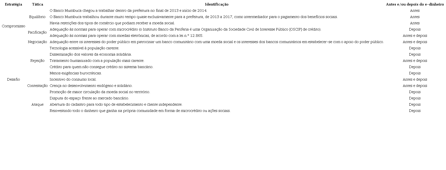 Além das entrevistas e e-mails trocados, a literatura já produzida sobre os vários assuntos que se relacionam com a história dos bancos comunitários foi relevante para identificar estratégias dessas organizações em geral, assim como os documentos oficiais, a exemplo de leis e normas. Especificamente no caso do Banco Mumbuca, além dos documentos oficiais e da literatura sobre o tema, foram também considerados os documentos não oficiais provenientes do portal da prefeitura e a observação direta. O resultado desse processo de triangulação das diversas fontes resultou na construção do conteúdo trazido na Tabela 4 com base em Oliver (1991), que sintetiza as respostas estratégicas com as respectivas táticas encontradas na pesquisa realizada no estudo de caso do Banco Mumbuca entre 2013 e 2018.