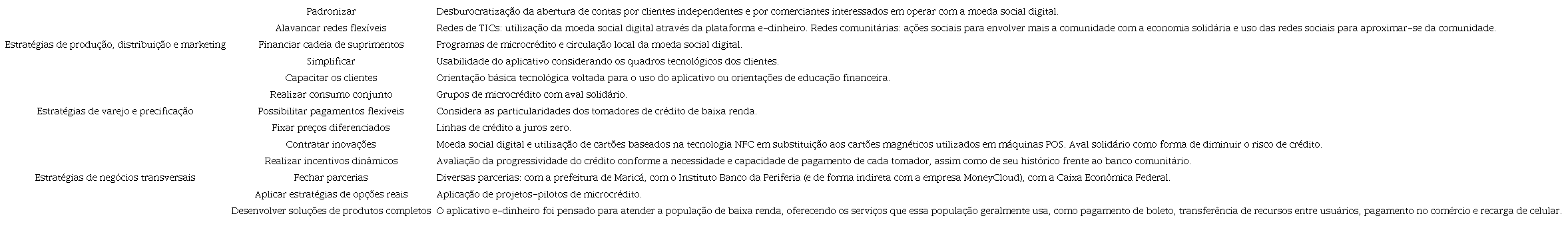 De forma complementar à discussão com base no trabalho de Oliver (1991), buscou-se a compreensão de quais iniciativas estão sendo tomadas pelo Banco Mumbuca apoiadas na tipologia identificada no trabalho de Mendoza e Thelen (2008). A partir deste estudo, foram identificadas várias estratégias, expostas na Tabela 5, em todos os três campos delimitados pelos autores, ou seja, nas estratégias de produção, distribuição e marketing, nas estratégias de varejo e precificação e, por último, nas estratégias de negócios transversais.