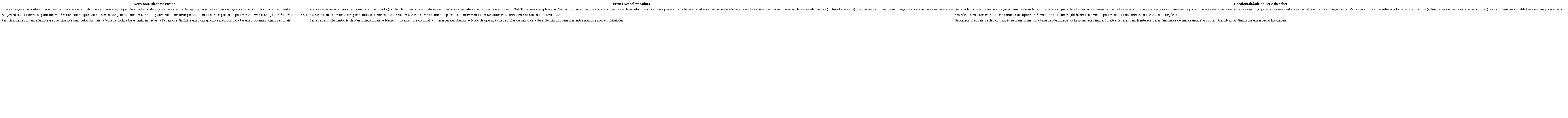 Conclusions: our study reveals that decolonizing the management and accounting curriculum in the South is permeated by difficulties for theoretical delinking, which trigger tensions about the constitution of personal/collective being, the mobilization of intellectual/practical activism, the creation of forms of engagement internal/external to the academy, transcending the competitive/solidaristic academic action model; the construction of knowledge in extractivist/non-extractivist forms; and the materialization of pluriversal knowledge in academic/non-academic products. We hope to encourage everyday decolonizing-recolonizing management and accounting education that goes beyond the North/South binarism and curricular reforms led by the counter-revolutionary neoliberal university and its Eurocentric business schools.