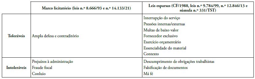 Como se observa, surgiram fatores (in)toleráveis previstos no marco licitatório ou em leis esparsas e tolerar não significou prescindir do interesse público, mas agir com fundamento em outros princípios constitucionais que estão explícitos e implícitos na própria lei de licitação ou em outras leis do ordenamento jurídico brasileiro.