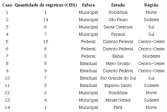 Optou-se por buscar os órgãos com a maior expressividade em número de registros de ocorrências de sanções. Buscou-se também a diversidade de esferas de governo e regiões geográficas, aliada à possibilidade de acesso, conforme a Tabela 1. Por se tratar de um estudo com método abdutivo, a maior preocupação foi buscar a variação entre os casos (Dubois & Gadde, 2002). Assim, quando os diálogos passaram a ficar repetitivos, interromperam-se as coletas de informações com as pessoas, o que ocorreu no 14º órgão pesquisado.