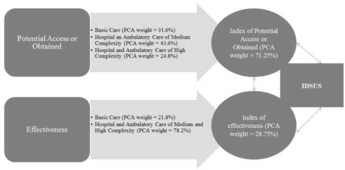 Given the presented assumptions, the IDSUS offers the result achieved by scores ranging from 0 to 10, considering all the necessary reflections to deal with the municipalities in different ways, once they present different socio-economic and structural conditions (IDSUS, 2011). Figure 1 shows the composition of the synthesis score presented by IDSUS, it also presents the methodology of analysis of the main components (PCA) utilized in the index structure that according to IDSUS (2011, p. 15, our translation), "constitute the composite indicators or index of potential or obtained access, and effectiveness indices in the distinct levels of health care attention".