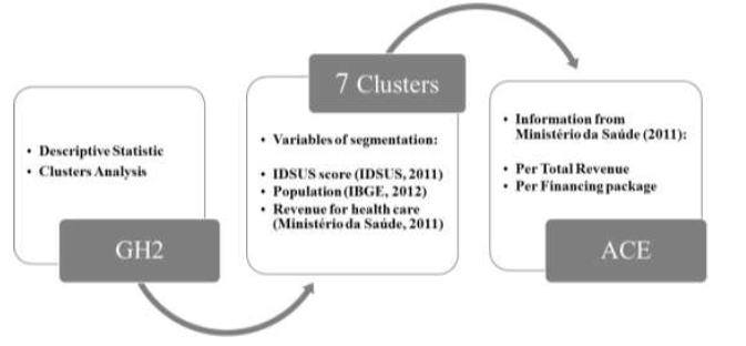 Then, after defining the similarity measure and clustering method, it is required to find the optimal number of clusters that will be used. For this, it was used the average connection method among the groups and after analysing the composed groups, observing the change variation of the internal heterogeneity and quantity of objects per group, the recommended number for use in the study was of seven groups for the set of 93 municipalities in the Homogeneous group 2. So, after being segmented the group into seven clusters with similar characteristics according to the variables described, the next step was characterized as the model structuring proposed for cost-effectiveness analysis, which is different the analysis already present in the literature, brings peculiarities. As variables for the composition of the cost-effectiveness analysis (Composição da Análise de Custo-benefício [ACE]) from segmentation of the groups, it was used the average revenue divided by the average score of the group in IDSUS. To illustrate the proposed model Figure 2 shows the building steps of this model, as well as the variables involved, in detail.
