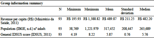 Firstly, data from IDSUS available at the Ministry of Health website was used, which refer to the triennial period of 2007 and 2010 and announced in March 2012; therefore, this study uses secondary data. The study universe is the Homogeneous Group 2, composed of 94 municipalities distributed in Brazil. The choice of this group is due to convenience of studying a group with reasonable number of municipalities and that presents high socioeconomic development, medium health care conditions and medium health care structure. It is also highlighted that the comparison between the groups cannot be possible, once the municipalities were split up into homogeneous groups in the IDSUS study for as it presented heterogeneous characteristics among different groups; the differences are related to municipalities with different sizes and health care structures, so it is chosen to compare municipalities belonging to same homogeneous group. The differences among the groups can be seen in Table 1.
