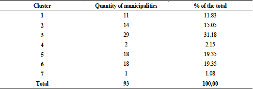 It can be verified from Table 3 that the group with the largest number of municipalities is the third one, with 31.18% of the total (29 municipalities); the smallest group, the number 7, has only one municipality with about 1.08% of the total. It is also possible to see that there are two groups containing 18 municipalities, with approximately 19.35% of the total in each one. By removing the groups 4 and 7, the groups are close to uniformity in the item quantity of municipalities.