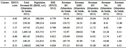 Aiming to improve the municipalities' analysis, it was created a profile of each group with additional information of human development (PNUD, 2013) and division the total revenue for health care in the five funding packages established by the Ministry of Health (Portaria n. 399, 2006) - Basic Care (BC), Hospital and Ambulatory Care of Medium and High Complexity (MHC), Health Vigilance (HV), Pharmaceutical Assistance (PA) and SUS Management (SM) - in addition to the variables used in the segmentation (IDSUS score, total revenue per capita and population).