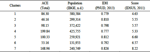 For deeper analyses of the municipalities and for better comparing them, the cluster analysis was used as a way to join them according to similar characteristics proposed by variables: IDSUS score, population and total revenue per capita on health care, as detailed in Table 2.