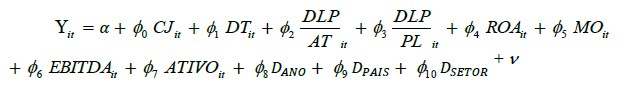 To measure the change in the structure of the capital of a company, Klein et al. (2011) use data of patrimonial balance sheet, different from Kisgen (2006), which adopts the concept of debts market debts. However, as pointed Klein et al. (2011), their results are qualitatively identical in both approaches. Thus, due to the lack of liquidity in the market of bonds from Latin America, the corporate debt in the research in question will be measured by its accounting values such as Klein et al. (2011), Booth, Aivazian, Demirguc-Kunt and Maksimovic (2001) and Bastos, Nakamura and Basso (2009). On this line, the dependent variables that will be used as proxy, for measurement of the change in the structure of the capital of i-ith firm, are represented by the variation in the accounting indebtedness in a period t+1 for a period t.