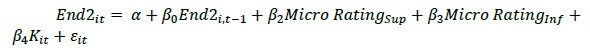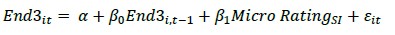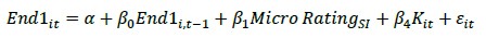 (7)In that End1it, End2it and End3 it are the variables that represent the levels of utilization of the debts of the company i in time t as described in detail in subsection Dependent and independent variables; End1i,t-1, End2 i,t-1 and End3 i,t-1 are shifted dependent variables in a period; Micro RatingSI, Micro RatingSup and Micro RatingInf are the variables of micro ratings described in subsection Dependent and independent variables; Kit represents all the control variables of the equations discussed in subsection Dependent and independent variables; βi, being i, =0,...,4, the parameters; and. εit the idiosyncratic term of error.