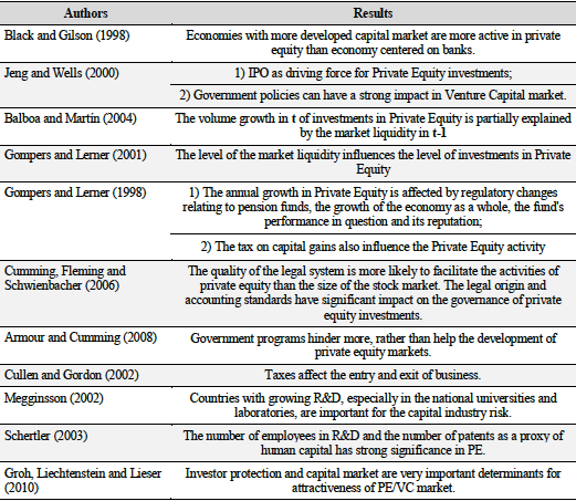 Some studies discuss the determinant attributes to the activity of the PE/VC market, but most of them deal with Private Equity markets and Venture Capital markets separately. The reasons for this are obvious: while some attributes have the greatest impact on early-stage companies, there are other attributes that directly affect mature companies already established in the market (Jeng & Wells, 2000). However, the intention is not to discuss these differences, and as consequence, both segments will be treated as a single element.