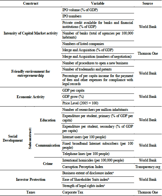 Table 2 shows the constructs and variables we used to describe them; a total of 25 selected variables divided in 6 constructs. The construct Social Development was divided into 3 sub-constructs: education, crime and communication. The crime and education variables were used in previous research to describe the construct under discussion. Communication variables were added since weak telecommunication structures disturb the development of the economy and market competitiveness (Frieden, 2005) can have a strong impact on businesses related to technology: a common characteristic of startups financed by venture capital.