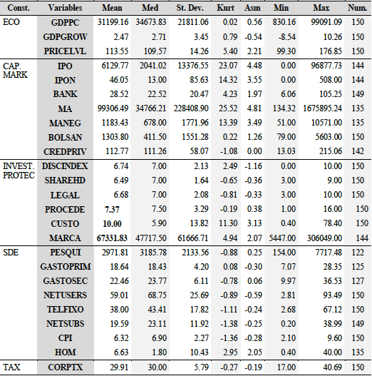 Table 3 shows the descriptive statistics of the variables commented on the theoretical framework and methodology divided by construct. Looking at the table below, the mean and median have values similar to the GDPPC, GDPGROW, PRICELVL, BANK, CREDPRIV, DISCINDEX, SHAREHD, LEGAL, PROCEDE, GASTOPRIM GASTOSEC, CPI and CORPTX variables. This shows possible evidence of normal distribution, but this analysis is not conclusive and a formal test is required. For this purpose, the Shapiro-Wilk test was executed. Only six variables did not reject the null hypothesis of normality (SHAREHD, LEGAL, PROCEDE, GASTOPRI, GASTOSEC, and CORPTX):