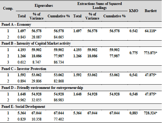 Panel E (Social and Environmental Development) presented the biggest explained variance, with a 67.04% total. The results of Table 3 show that all the constructs have formed a single factor, except for the Capital Market. This one was split in two factors to explain 77.98% of the variables variance. After evaluating the structure of these factors, it was possible to differentiate them through the variables that composed these factors: the first factor has grouped variables related to the capital market and the second factor has added variables of financial institutions and banks.