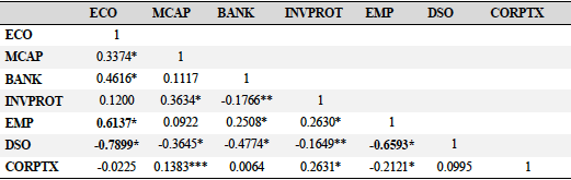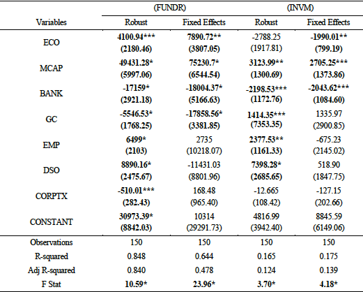 On the demand side (VAR: INVM), the explanatory variables presented statistically significant coefficients for the variables MCAP and EMP at 5% of significance level. The variables BANK and INVPROT have presented significant coefficients at 10% of significance, and DSO at 1% of significance level. CORPTX and ECO were not significant. However, from the fixed effects regression it shows the variable ECO as negative and significant.