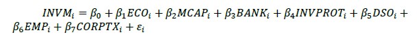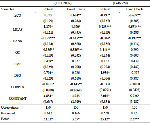 On the demand side (VAR: INVM), the explanatory variables presented statistically significant coefficients for the variables MCAP and EMP at 5% of significance level. The variables BANK and INVPROT have presented significant coefficients at 10% of significance, and DSO at 1% of significance level. CORPTX and ECO were not significant. However, from the fixed effects regression it shows the variable ECO as negative and significant.
