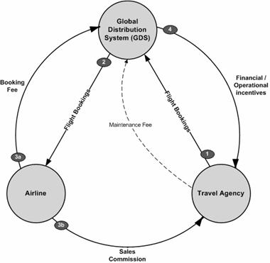 The GDS business model is primarily based on collecting booking fees from the content provider for purchase transactions made by travel agents. Thus, travel agency production of bookings generates the revenue that accounts for both GDS profits and the expenditures associated with developing and maintaining the system. With respect to airline content, the carrier that distributes its flights though the GDS pays the booking fee. In addition, travel agencies that do not generate the contractually determined number of bookings are subject to GDS administrative fees, and travel agencies that surpass contractual booking targets receive financial or operational rewards. Figure 2 provides an overview of the economic path described above.