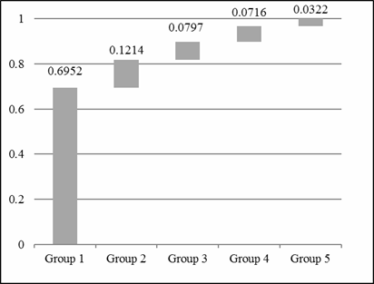 Figure 3 presents the distribution of POS per group for the 5-class model. Groups were named after the quantity of POS each group presented. Group 1 has the majority of POS (almost 70% of the sample's POS) and Group 5 has the fewest POS in the sample (approximately 3%).