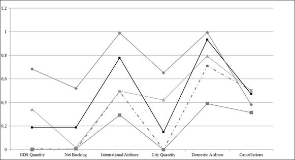 Observing our results, it is noticeable that this market is experiencing change - especially considering the context of airline industry during the second decade of the 2000s (ABEAR, n.d.; retrieved March 2014 from http://www.abear.com.br/dados-e-fatos/page), but the type of change can be defined by forming different types of market cells that can be grouped as strategic players. It does not resemble a stagnated or inactive market by any means. The movement of bookings and use of different types of GDS indicate strategic movements to deal with this new economic environment, and reactions to this disintermediation are still on course. Small and medium-sized agencies would have vanished by now if they did not offer a service or an advantage to retain loyalty from consumers. Unifying with similar businesses in distinctive groups similar appears to be their competitive advantage and strategic plan for survival.