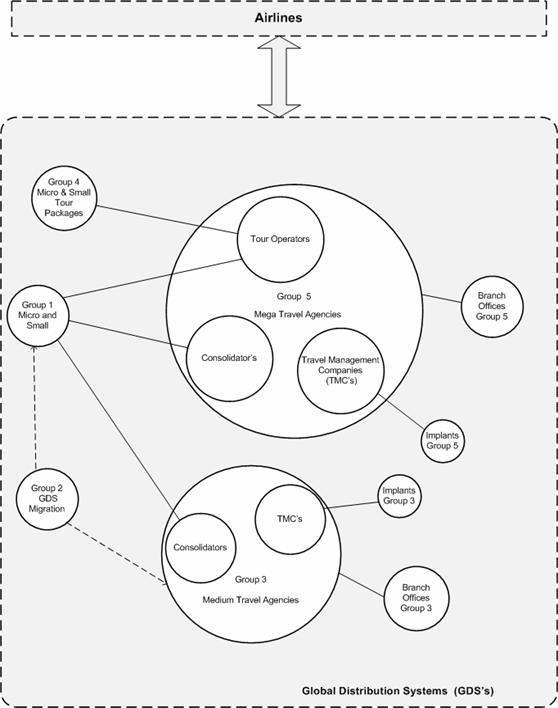 The Medium Sized Agencies, Group 3, is characterized by a low number of GDS use but more international airline reservations and a higher number of net reservations than Group 2. The fourth group, Leisure Tour Packages, has a low number of GDS (99.97% use only one GDS for its reservations), but it covers a considerable number of national and international airlines with a lower percentage of cancellations than Groups 1, 2 and 3 (between 60 and 80%). Finally, the last group, the Mega-Travel Agencies can be characterized by the use of numerous GDS, access to many national and international airlines, a very high number of net bookings with the same cancellation percentage as Group 4. Figure 5 summarizes the strongest relationships among the travel agency strategic groups and other market participants identified in this study.