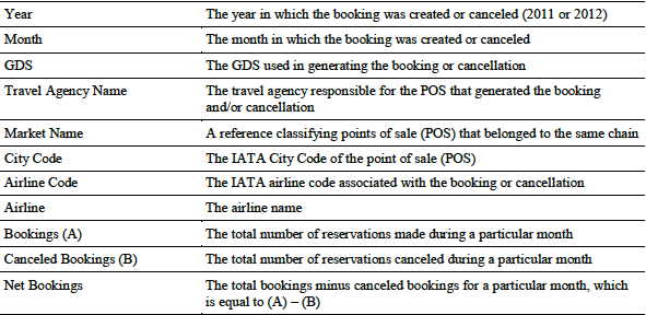 The sample data included monthly data on the number of bookings created and canceled at each point of sale (POS). Data were stratified by airline and the city in which the booking or cancellation occurred. The data also included information regarding the GDS used in generating the booking or cancellation. Table 1 describes the types of sample data used in this study.