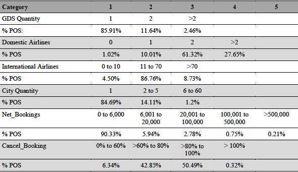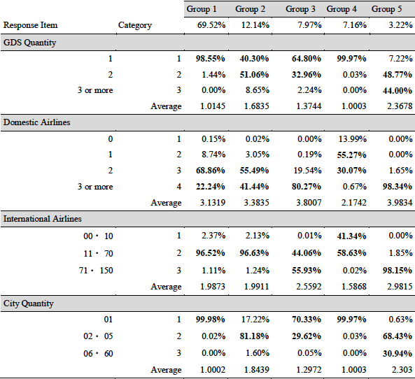 The groups labeled Agency in Table 2 were obtained by combining the data contained within the fields Travel agency name and Marketing name identified in Table 1. Because latent class analysis uses categorical data and some source data were continuous data, the data were categorized so that the analysis could be performed using the latent class method. The criteria employed and the initial results are presented in Table 3.