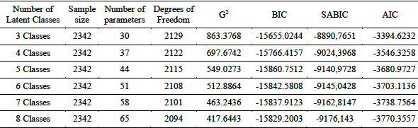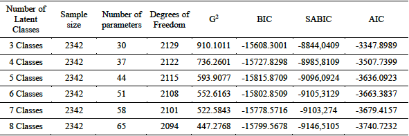 The first step of the estimation is to determine the number of latent classes in the model. This step requires the use of criteria such as statistical analysis, parsimony and interpretation that are applied simultaneously.