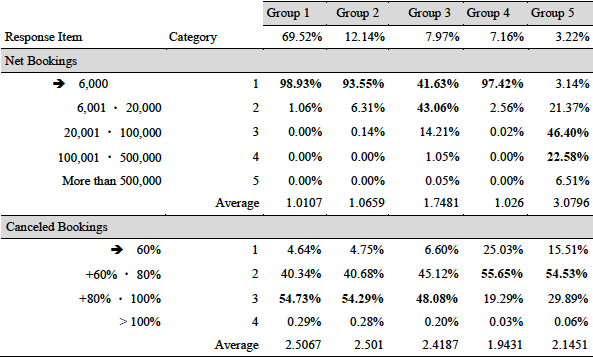 For instance, both separation and homogeneity appear to be poor for booking cancelations. However, the agencies in Groups 4 and 5 exhibited similar behaviors although they produced completely different net bookings. This result is directed related to our first hypothesis: