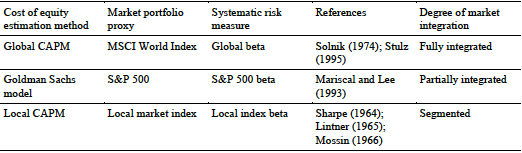 It is reported in the literature that investors tend to adjust their valuation methodology as a function of their perception of how much the particular market is integrated into the world market (Keck, Levengood, & Longfield, 1998). It is also emphasized that it is possible to construct a parallel between cost of equity computation methods and a market's degree of integration (Fuenzalida & Mongrut, 2010; Harvey, 2005; Stulz, 1999).