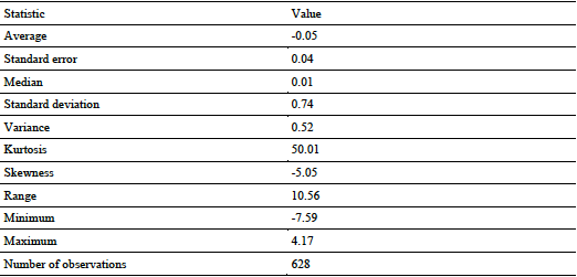 Although the Hausman test did not lead to the rejection of the null hypothesis that the random effects model would be appropriate (chi-square = 2.8196, p-value = 0.4026), equation (6) was estimated with the fixed effects model. According to Wooldridge (2008), the assumption that unobserved effects are uncorrelated with the explanatory variables is an exception to the rule, and for this reason the fixed effects model is widely used. In addition, for time-varying explanatory variables, the random effects model is recommended only when the sample is randomly selected. This is not the case in the present paper, in which, for every year, the stocks selected were those included in the IBrX 100 index.