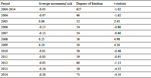 Table 3 displays the sample averages obtained for incremental risk in each of the sample years, as well as the results of t-tests for the null hypothesis of full integration (incremental risk measure equals to zero, against the alternative of partial integration, under which the risk measure would be positive). This one-tail test is done at the 5% level, for which the critical t-value is approximately equal to 1.67.