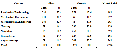 The presence of female students in the production engineering course is significant (42.6%), followed closely by metallurgical engineering (37.6%). In the health courses, on the other hand, the share of male students is small, with the highest percentage in biomedicine (24.4%).