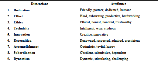 Dynamism was the predominant dimension in engineering and ranked third in health. It means that the students believe that the profession is dynamic, stimulating and challenging. Technicity is considered as the quality or condition of what is technical, that is, a specialized knowledge that will comply the function of distinguishing one professional group from another, that is, of helping in the construction process of group identities and of a certain professional status. This dimension ranked first in health and second in engineering and is associated with the attributes intelligent, wise, and studious, granting the profession certain scientific characteristics.