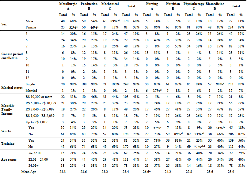 Most male and female respondents are single and are taking subjects in the fifth and seventh course semesters (76% in engineering and 67% in health). The lesser presence of last-year students in the classroom was due to the fact that they were in training, and also due to the natural process of drop-out and retention throughout the course.