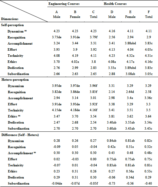 Finally, the largest difference between self and hetero-perception for the respondents in health is found in dynamism (0.82), ethics (0.81), and effort (0.75), once again showing that the other does not correspond to the individuals' view on their professions, which can cause frustration. In engineering, on the other hand, a greater correspondence is identified between the students' and the society's perception, as the largest difference between self and hetero-perception corresponded to 0.30 in the dedication dimension.