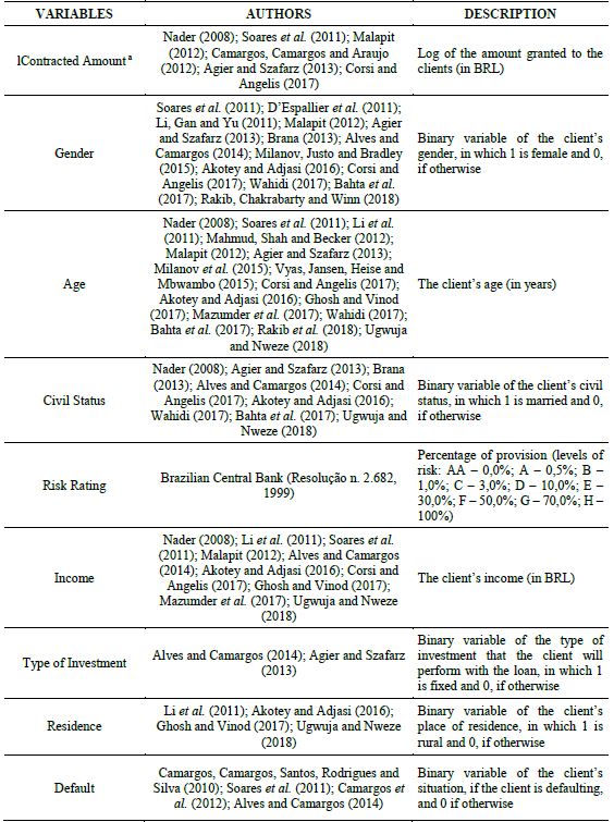 It is worth mentioning that the source for the risk criterion is based on the bank rules from which the data were collected, which take into account the standards established by the Brazilian Central Bank. In addition, it should be noted that all variables used in the model were chosen based on studies and were used by the authors indicated in Table 1.