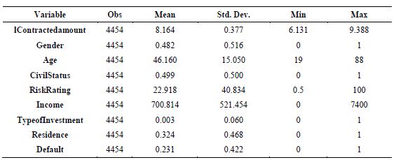 Table 2 is presents the descriptive statistics of the data collected in the research. For the purpose of analysis, it can be seen from the table above that the variables that are not dummies (the ones that are not 1 or 0) present the following contexts: the variable log of the contracted amount shows that the minimum contracted amount was 6,131 and the maximum was 9,388; the age variable shows that there are clients in the sample with a minimum age of 19 years and a maximum age of 88 years; the risk classification variable presents the H level (100%) and the level A (5%) as the highest level of risk according to the provision table; and that the income variable shows that that are clients with the maximum income of 7400 BRL and minimum of 0. This fact justifies, as an example, the non-use of this variable in the log form, which at first would be more advisable for monetary values, but which does not admit null value, as Wooldridge (2012) points out.