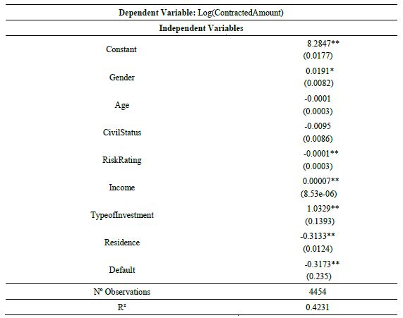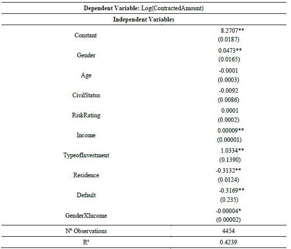 On the variable of interest, gender, we can observe that women obtain a value approximately 1.91% higher than men. In addition, we can see that the proposed model presented a R2 of 0.4231, which according to Hair, Anderson, Tatham and Black (2005), represents the variance percentage of the dependent variable explained by the set of independent variables. Therefore, we estimated that approximately 42.31% of variable lContracted Amount is explained by a set of dependent variables.