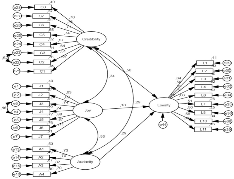 In accordance with Cohen (1992), the coefficient of determination's (R2) statistical significance can reveal a small effect (2%), medium effect (13%) or major effect (26%). Based on the results from Table 5, it is possible to affirm that brand personality dimensions influence 56% of the explication for loyalty variable, which is a major effect. Lastly, fit indexes were checked once again, confirming the satisfactory fit (CMIN/DF=2.04; CFI=0.90; RMSEA=0.06; SRMR=0.07). The structure model is presented by Figure 1.