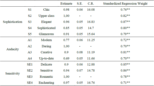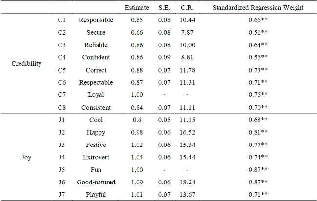 In Table 1, we present the results from the CFA performed for the Brand Personality scale. It shows the brand personality dimensions, estimates, standard errors (S. E.), critical ratio (C.R.) and the standardized regression weight. All items in the scale were significant (p-value <0.01).